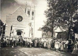This photo was taken at the dedication of present sanctuary, August 28, 1949.